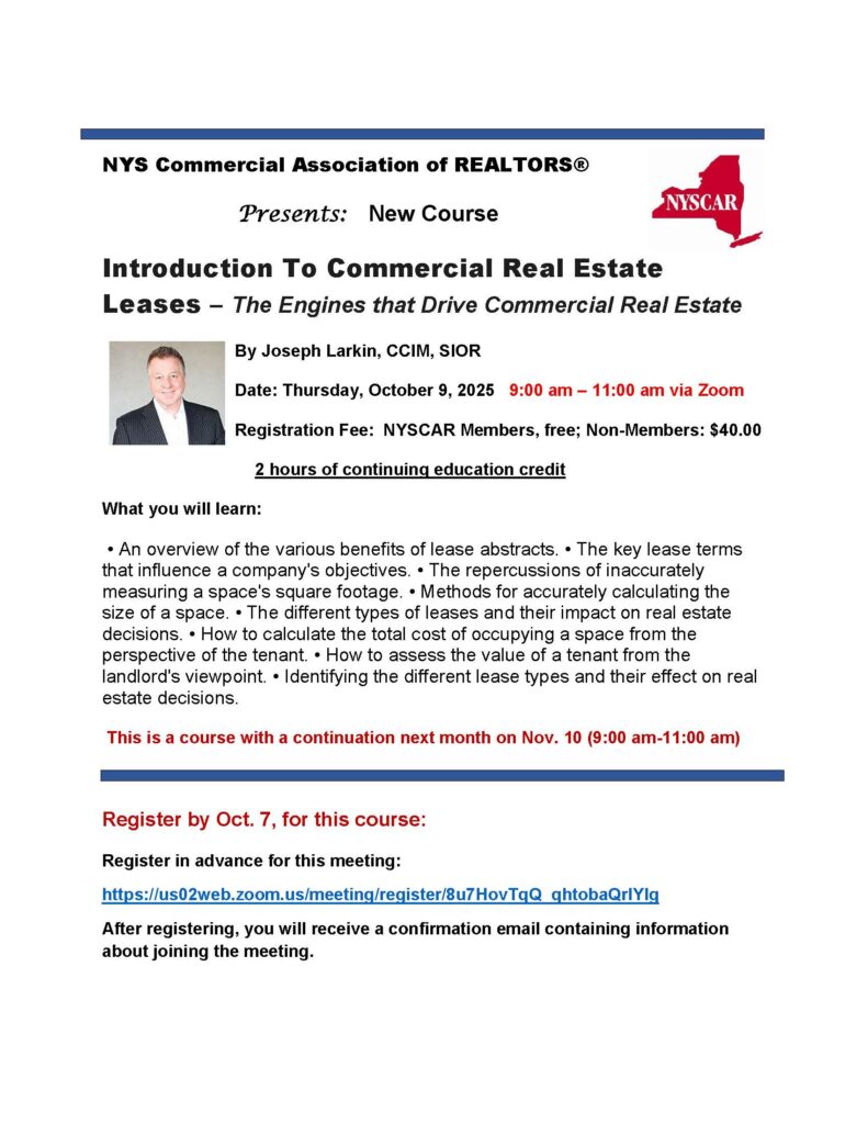 Introduction to Commercial Real Estate Leases via Zoom Thu Oct 99:00 AM - 11:00 AM Fee: NYSCAR Members - Free; Non-Members $40 Professional Development Register for this class here. After registering, you will receive a confirmation email containing information about joining the meeting.