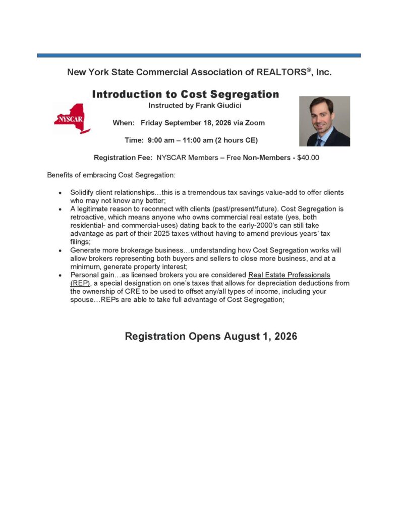 Introduction to Cost Segregation via Zoom Fri Sep 189:00 AM - 11:00 AM Fee: NYSCAR Members - Free; Non-Members $40 Professional Development Registration opens August 1, 2026.