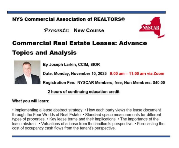 Commercial Real Estate Leases: Advance Topics and Analysis via Zoom Mon Nov 109:00 AM - 11:00 AM Fee: NYSCAR Members - Free; Non-Members $40 Professional Development Register for this course by November 6. After registering, you will receive a confirmation email containing information about joining the class.