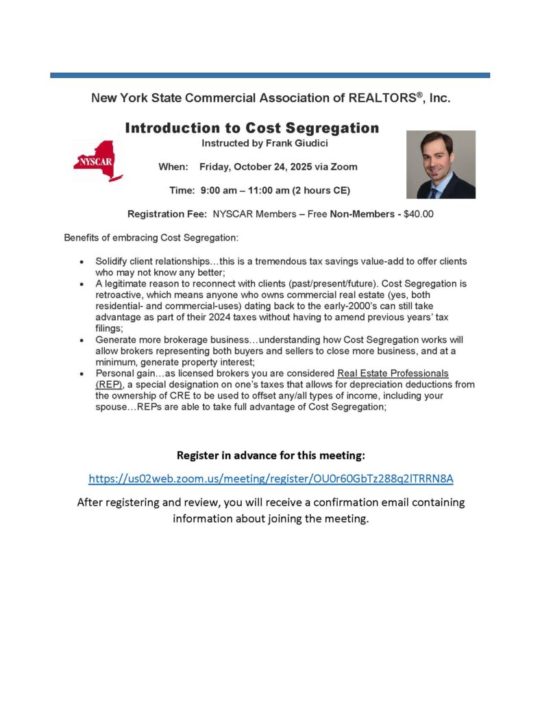 Introduction to Cost Segregation via Zoom Fri Oct 249:00 AM - 11:00 AM Fee: NYSCAR Members - Free; Non-Members $40 Professional Development Register in advance for this course here.
